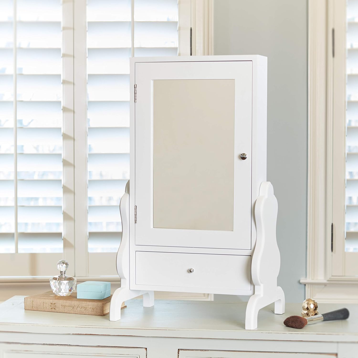 Ideal for bathrooms and smaller bedrooms the mirrored design of the belham living hollywood mirrored locking wall mount jewelry armoire gives any room the appearance of being larger. Langria lockable jewelry cabinet standing jewelry armoire organizer with mirror full length standing jewelry storage 4 angle adjustable for rings earrings bracelets broaches white finish. Each of the three lined shelves are removable and feature four compartments each.