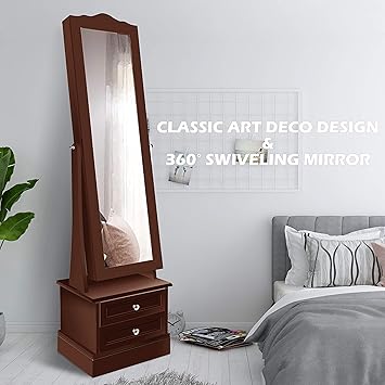 Amoiu Jewelry Cabinet Full Length Mirror Standing Lockable Armoires Space Saving Jewelry Organizers For Jewelry Storage Brown