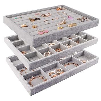 Mebbay Stackable Velvet Jewelry Trays Organizer Jewelry Storage Display Trays For Drawer Earring Necklace Bracelet Ring Organizer Set Of 3 Grey